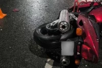 От удара мотоцикл отбросило влево – он врезался в два припаркованных автомобиля Dewoo и Audi.