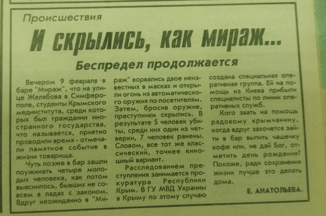 9 февраля 1996 года в симферопольском баре «Мираж» случилась трагедия. Ворвавшиеся туда люди с автоматами расстреляли всех, кто находился в небольшом зале. На фоне того кошмара, что творился тогда в Крыму, эта трагедия могла бы показаться одной из многих. Если бы не пострадало столько людей, не имевших отношения к бандитским конфликтам.