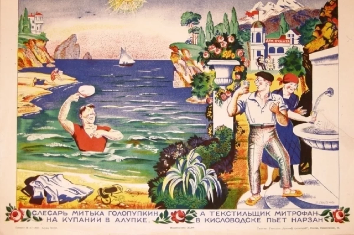 Но уже через несколько лет ситуация изменилась. И официальная пропаганда ярко рисовала доступность отдыха и лечения в Крыму для простых людей. Один из самых узнаваемых плакатов того времени щеголял забавным пояснением: «Слесарь Митька Голопупкин на купании в Алупке, а текстильщик Митрофан в Кисловодске пьет нарзан».
