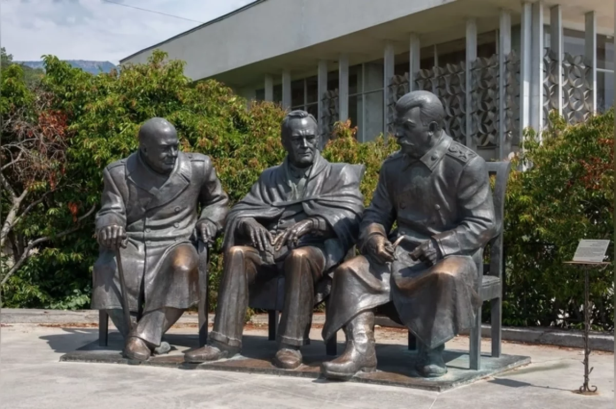 В Ливадии находится солидный и серьезный памятник — «Большой тройке», лидерам трех стран, обсуждавших на Ялтинской конференции 1945 года послевоенное мироустройство. Ярче всего блестят трубка и манжет кителя Сталина. А вот почему у всех, расположившихся на скамейке, членов «Большой тройки» сверкают коленки, догадаться нетрудно: на них нередко присаживаются посетители ради эффектных фото.