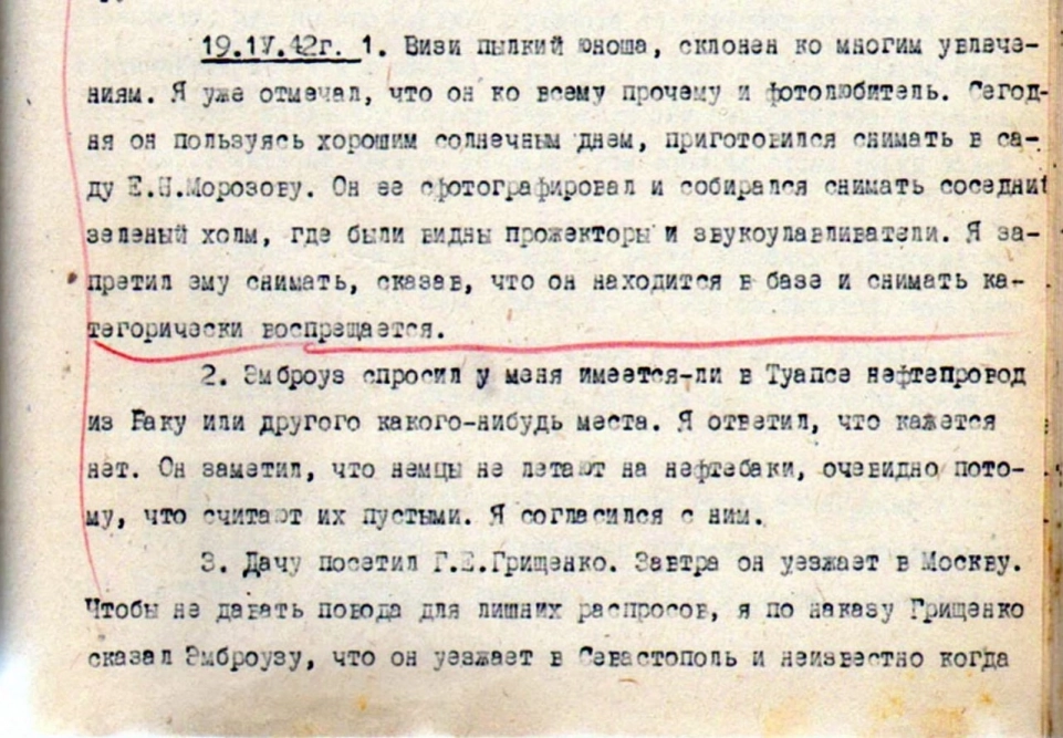 Но в рабочих моментах по-прежнему было все сложно. Эмброуз настаивал на том, что от него утаивают сведения. Например, в мае он где-то услышал, что на аэродроме в Сарабузе Симферопольского района (Крым, кроме Севастополя, был оккупирован), замечены аэростаты и немецкие четырехмоторные самолеты. Наша разведка это не подтвердила, и Эмброуз громко ее критиковал, обвиняя в неточности и плохой проверке информации. Сам-то он поспешил об этом донести руководству — и, получается, попал впросак.