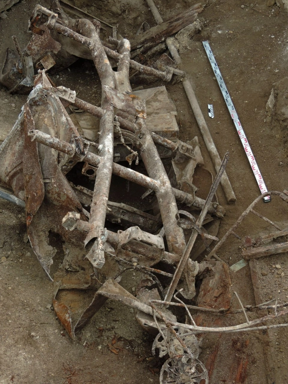 Завал разбирали не из-под земли, а заложили раскоп сверху. Поисковики шли «сверху вниз», методично расчищая землю. Сначала показались корпуса советских противотанковых мин. Затем — рама металлической кровати с панцирной сеткой, часть конструкции из бревен, скрепленных проволокой. И — человеческие останки. Боец был в летнем обмундировании и шинели, от которых сохранились кусочки ткани. Пуговицы, армейские ботинки — и никаких документов.