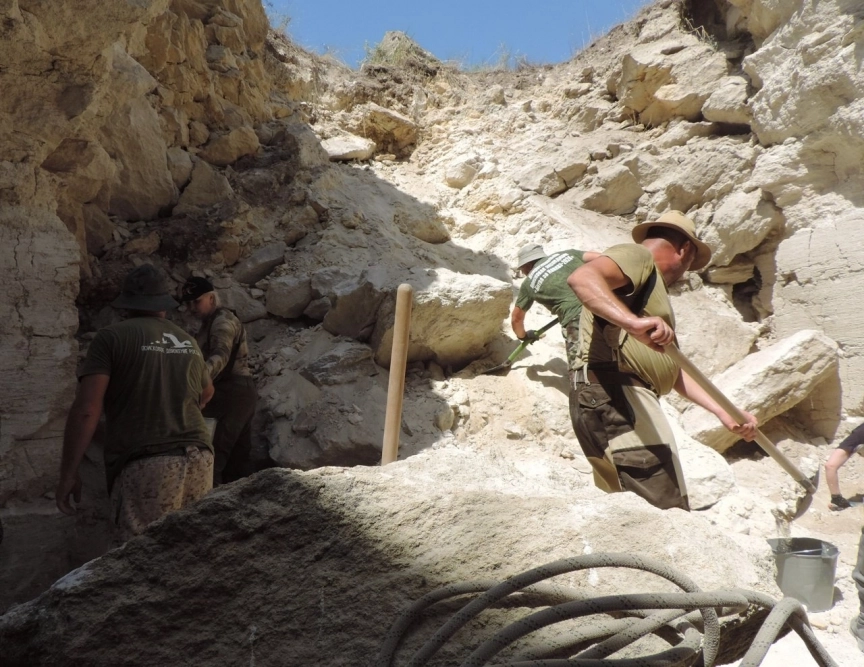 На «Лошадином завале» ранее и разведки, и раскопки уже велись. По информации Владимира Симонова, работы здесь довольно трудоёмки: чередуются участки перемолотого взрывом камня и крупных массивных плит. А в этом году пришлось ещё снять немало породы дополнительно с самого завала — чтобы избежать неконтролируемых обрушений растрескавшихся плит сверху.